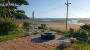 야외 잔디밭, 화덕, 정원 아래 계단으로 내려가 모래사장, 갯벌, 바다를 즐길 수 있습니다.